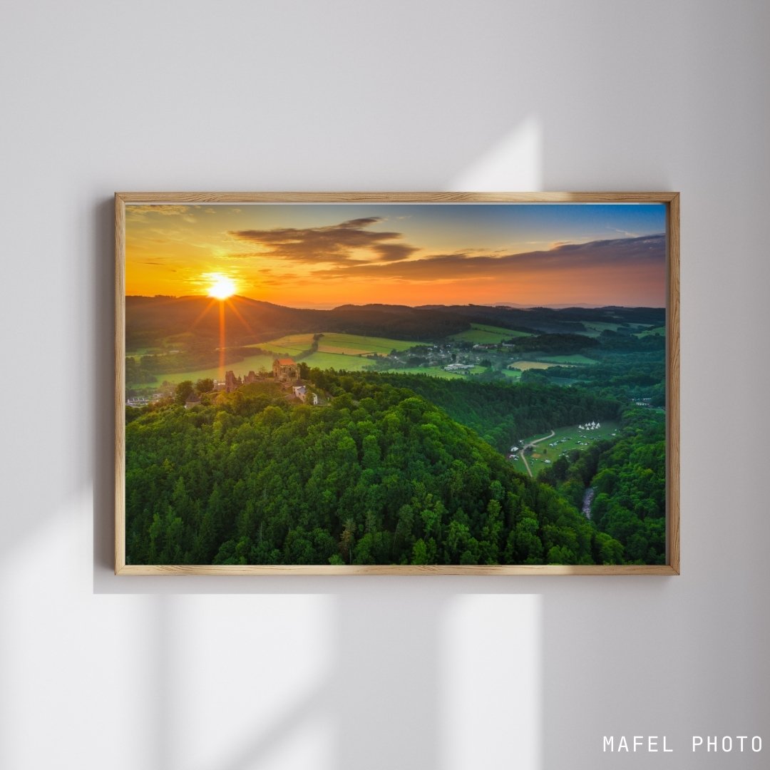 Autorská fotografie hradu Potštejn zachycená při východu slunce, kdy první paprsky osvětlují historickou zříceninu a okolní krajinu v Orlických horách.